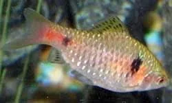 The Odessa barb (Pethia\ padamya) is a vibrant freshwater fish known for its striking red and black coloration, especially in males. Males develop a bright red horizontal stripe across a black or silver body, while females have a silver or pink body with a black spot near the pectoral fin. These active and hardy fish are omnivores that grow up to 4 inches (10 cm) and are ideal for community tanks with plenty of open swimming space.