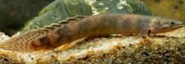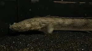 The Lapradei Bichir (Polypterus lapradei) is a prehistoric, eel-like fish native to African rivers, including some in Nigeria. It features an elongated, subcylindrical body covered in thick, armor-like ganoid scales, a distinct lower jaw that is longer than the upper jaw, and a unique dorsal fin made up of many small finlets. This carnivore has excellent smell due to its prominent nostrils and can breathe air with its lung-like swim bladder, making it hardy in low-oxygen environments. It is semi-aggressive and can grow up to 28 inches or more.
